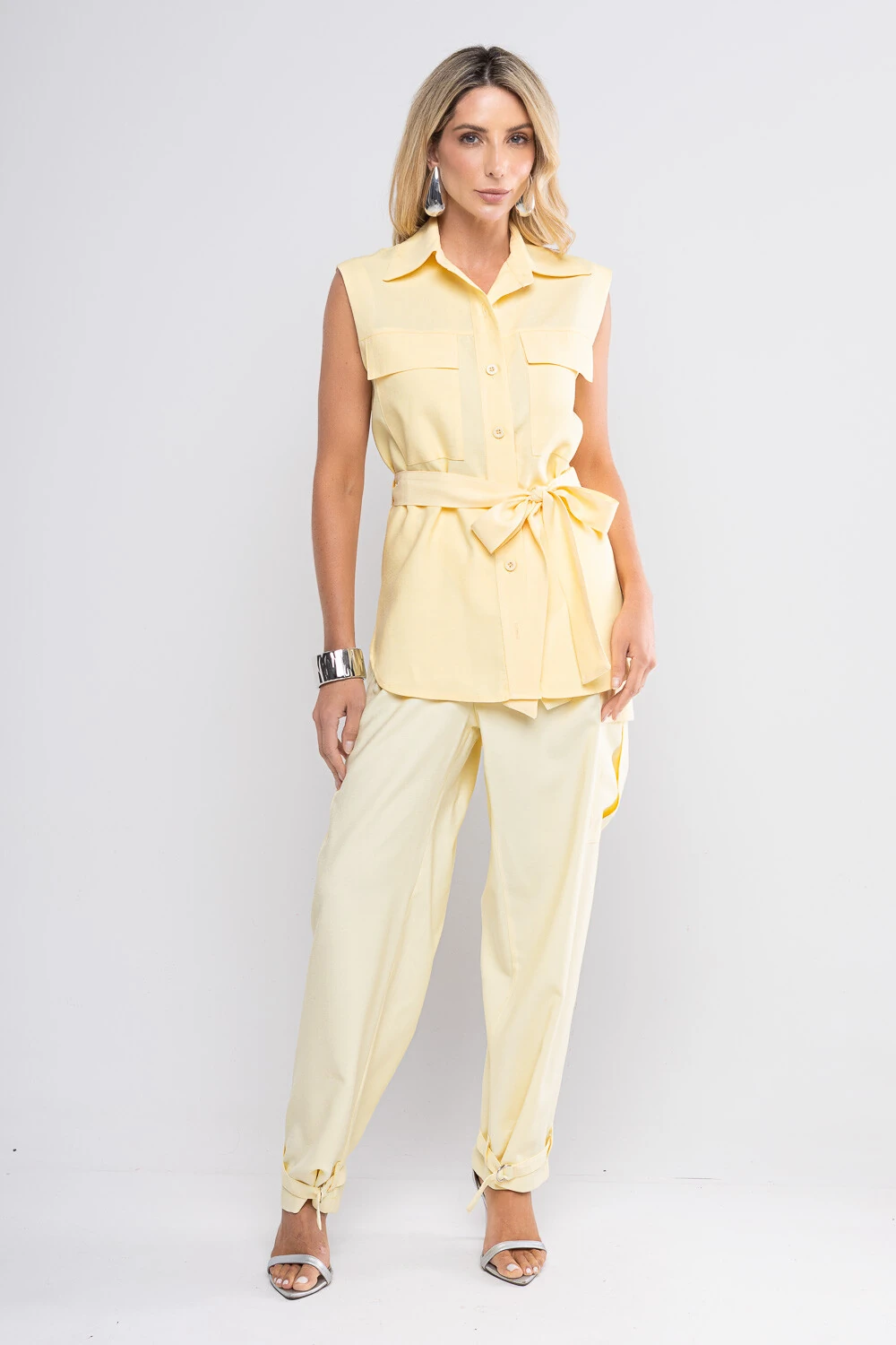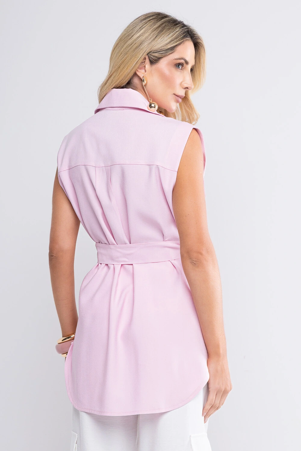 Acompanha cinto faixa na mesma cor e tecido, fechamento por botões, bolsos frontais funcionais com lapela e gola dobrável.