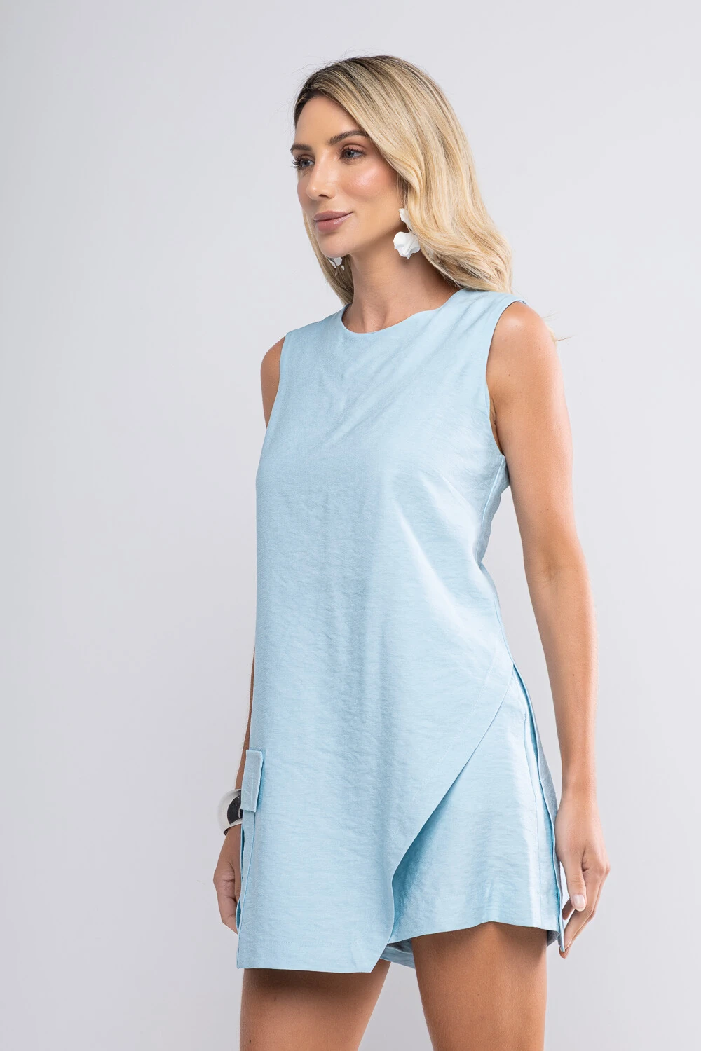 Conjunto Sara, confeccionado em alfaiataria de viscose, modelagem assimétrica, decote nas costas com fechamento por botão.