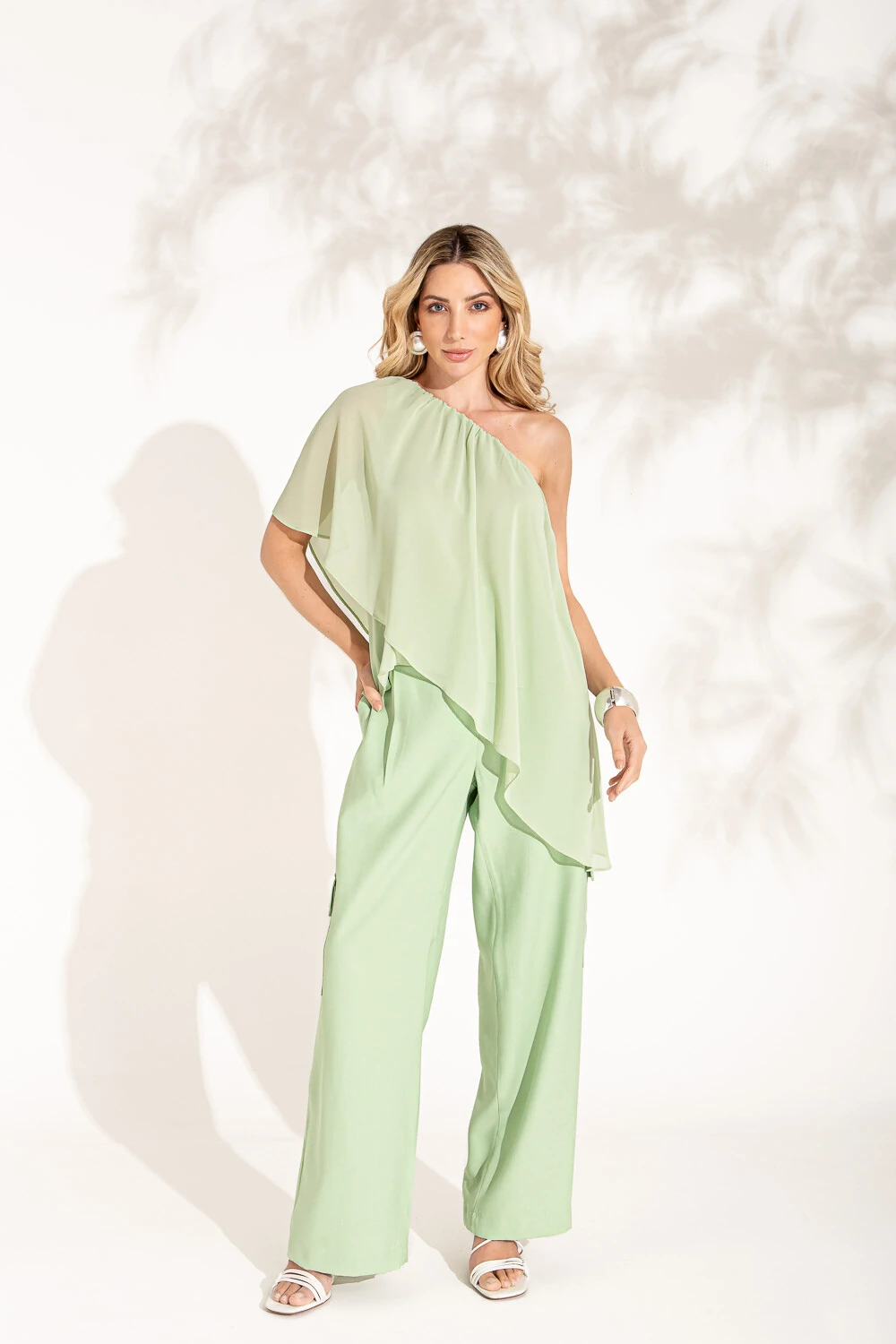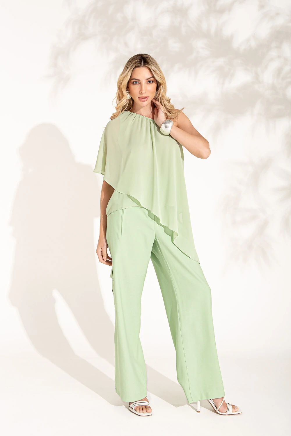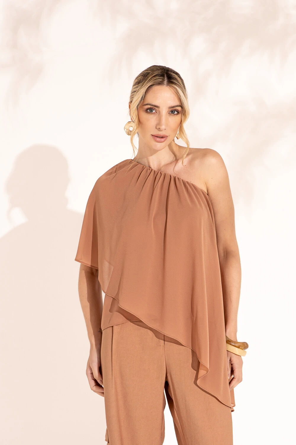 Blusa de modelagem assimétrica, leve e fluído. Possui forro com elástico proporcionando conforto e segurança ao vestir.