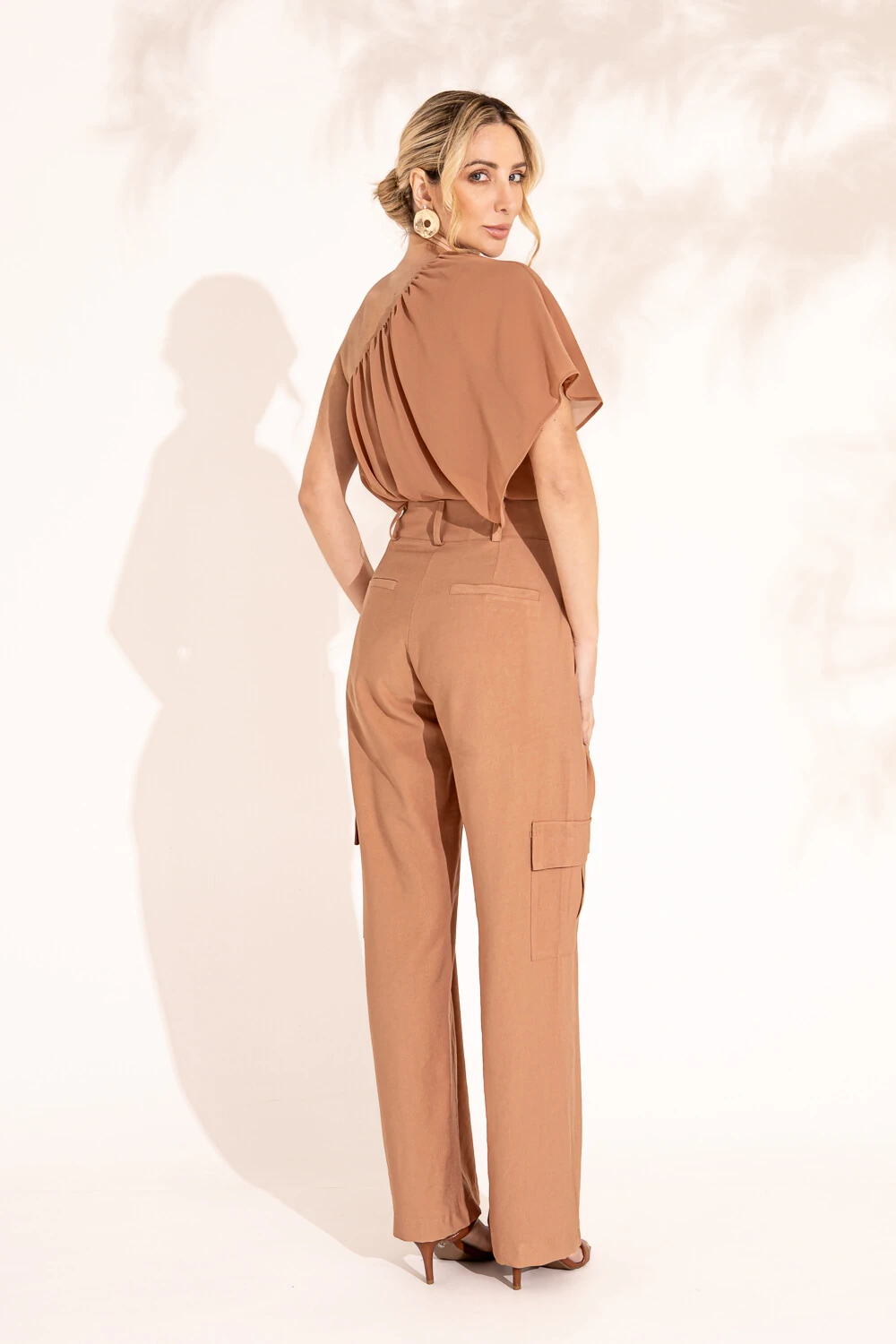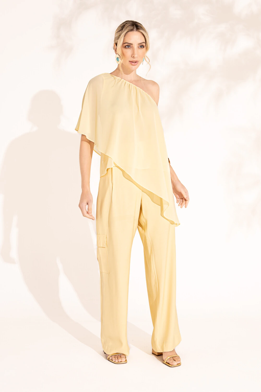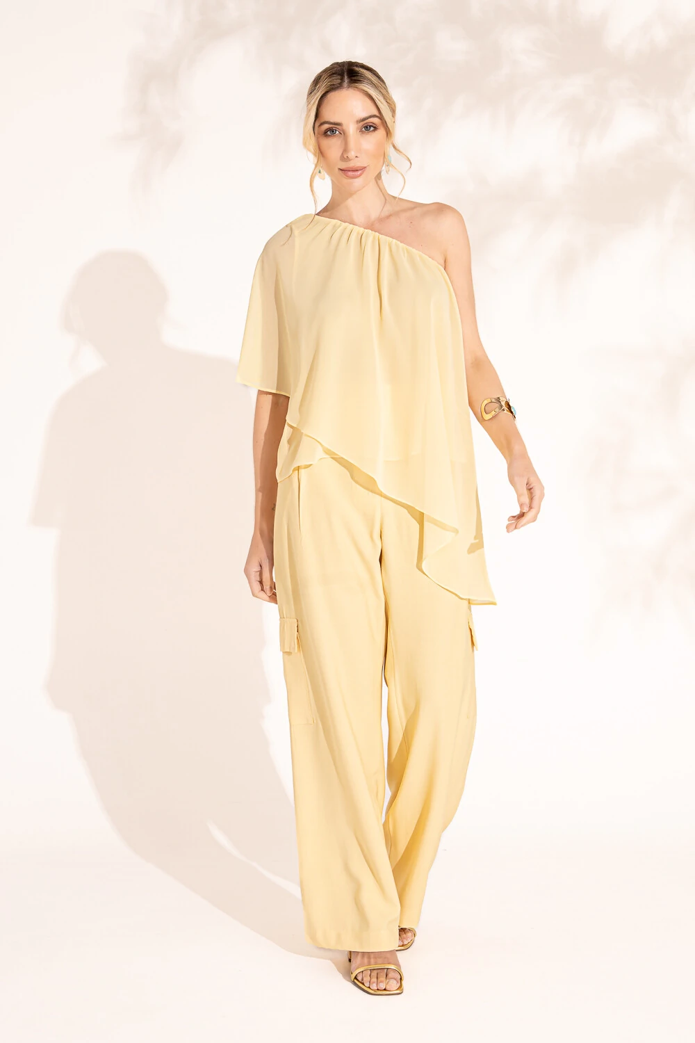 Blusa de modelagem assimétrica, leve e fluído. Possui forro com elástico proporcionando conforto e segurança ao vestir.