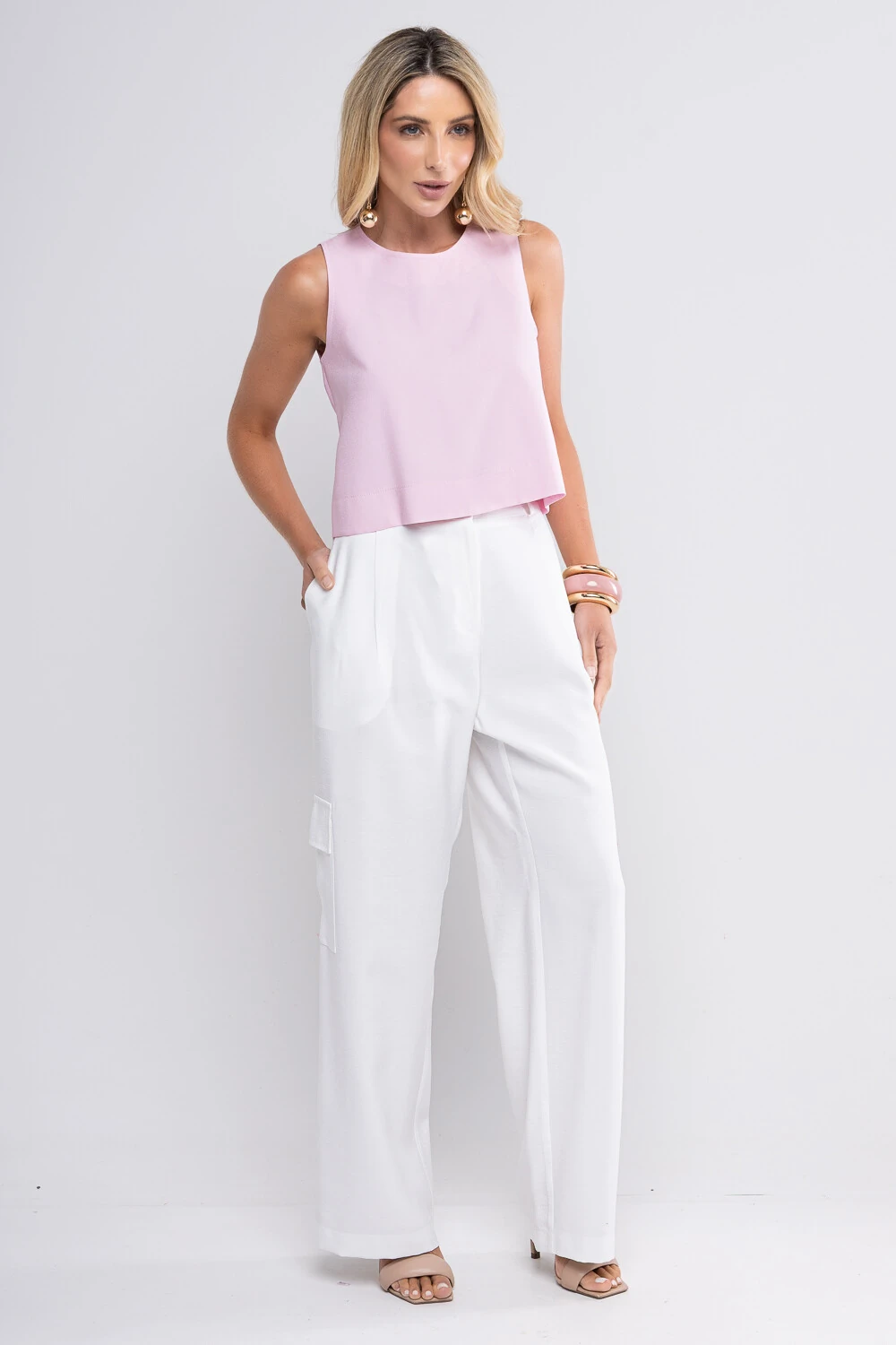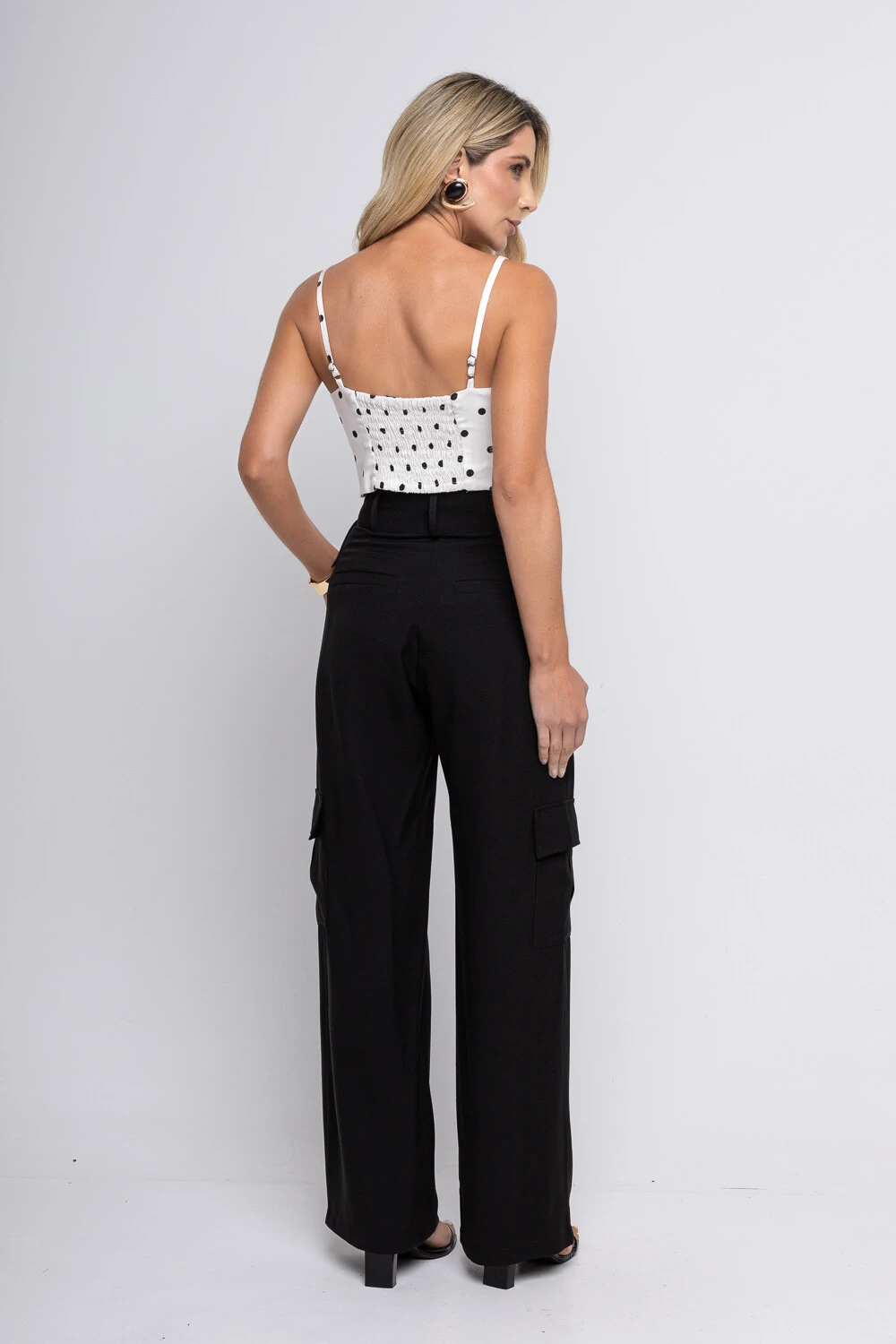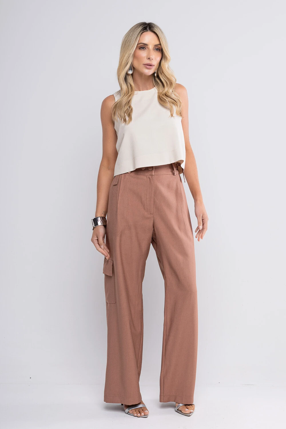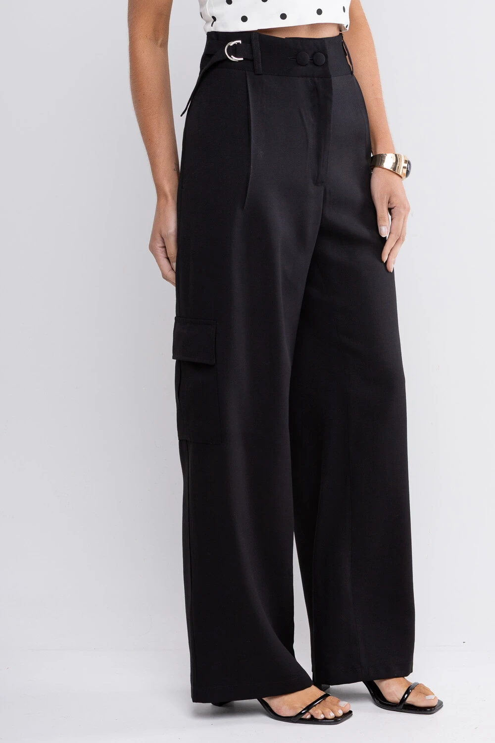 Calça Alicia confeccionada em alfaiataria de viscose, modelagem reta estilo pantalona, possui detalhe de ajustes nas laterais e bolsos cargos.