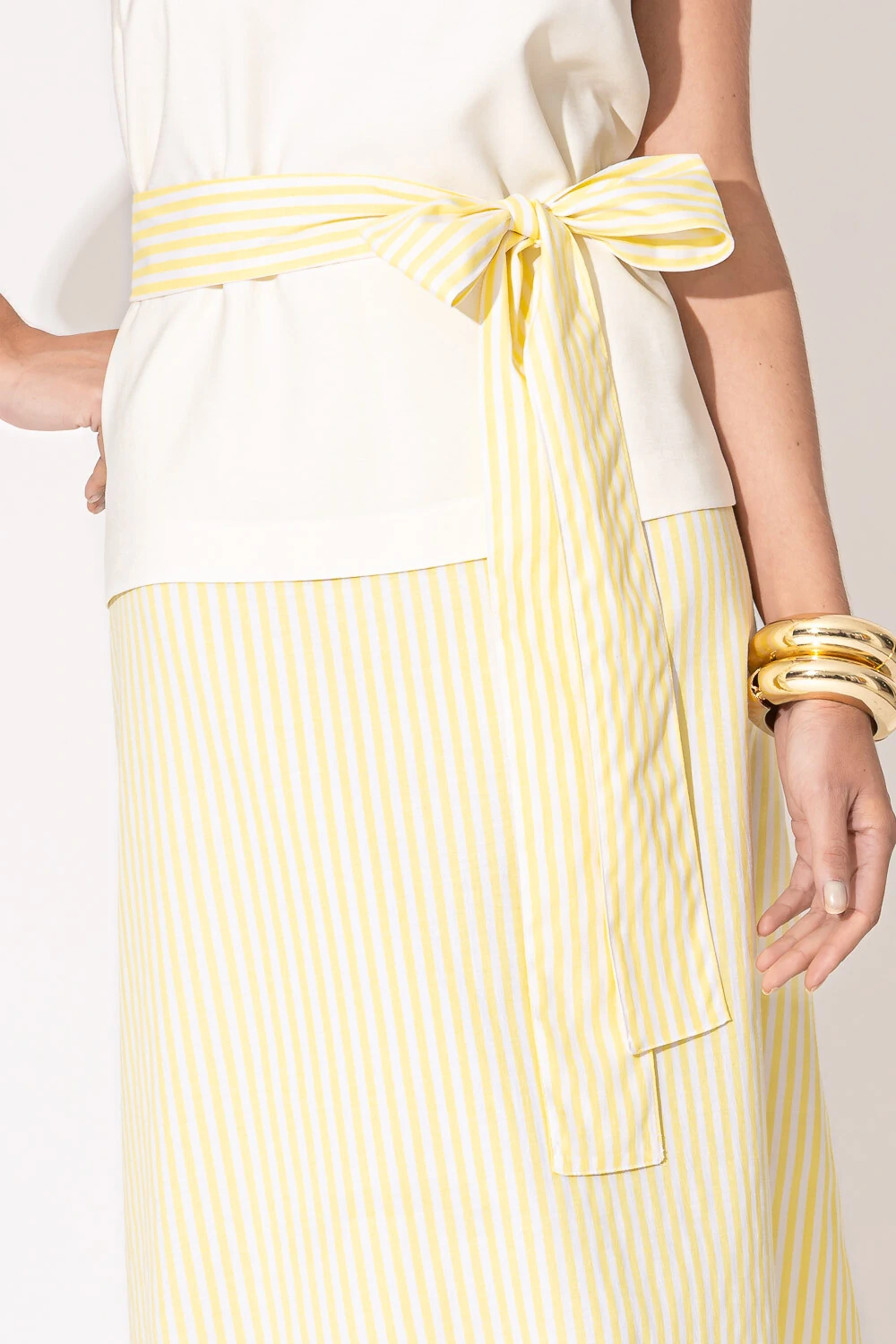 Confeccionado em uma mistura de troline e viscose, o tecido garante conforto e respirabilidade, perfeito para enfrentar o calor com elegância. O modelo conta com forro interno para maior segurança e um cinto faixa listrado que valoriza a cintura e adiciona um toque extra de personalidade.