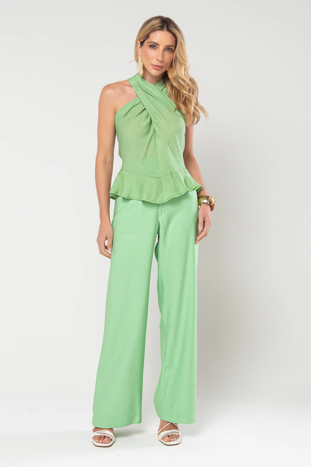 Possui modelagem transpassada no busto que forma um decote halter elegante, deixando os ombros a mostra.