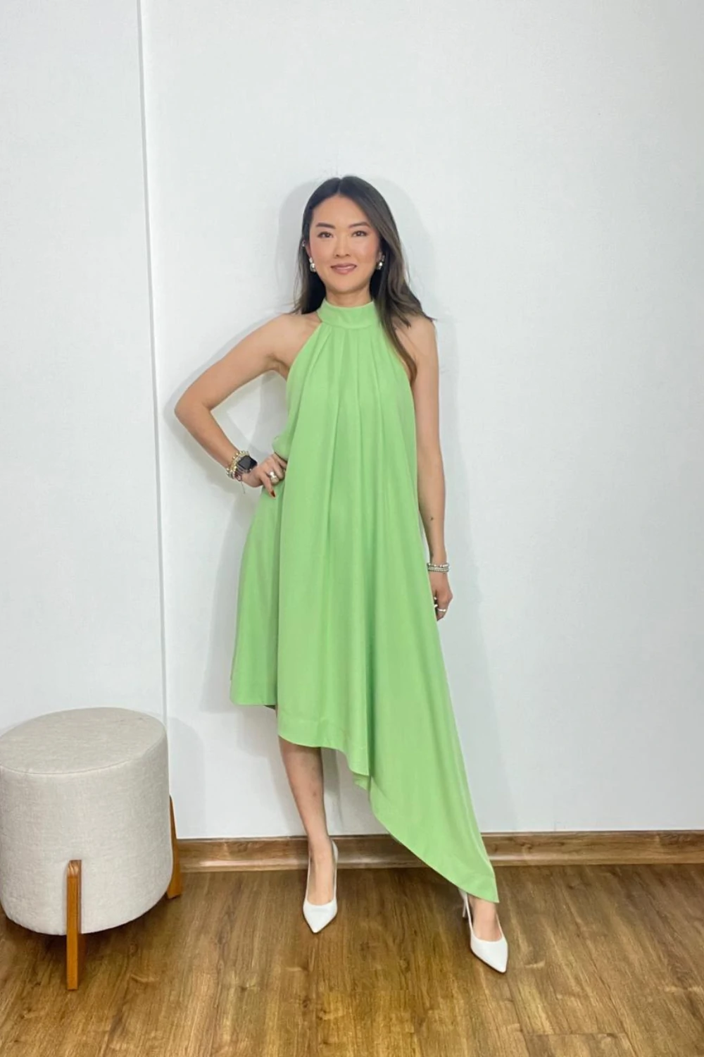 Confeccionado em tecido leve e fluido, ele apresenta uma silhueta assimétrica que adiciona movimento e personalidade ao visual.