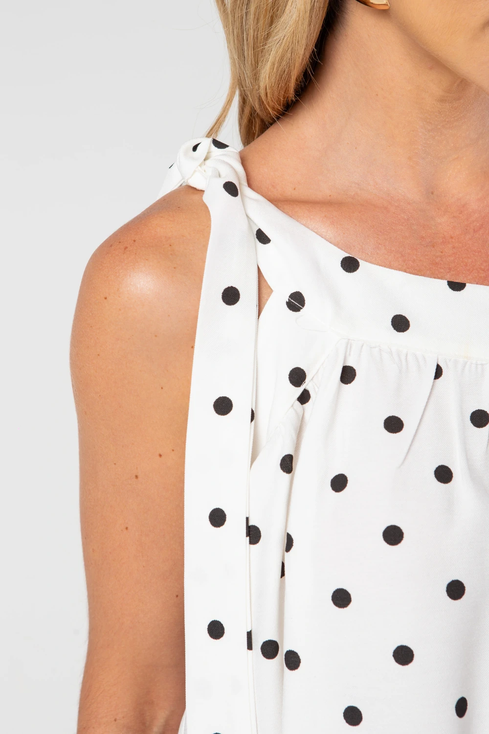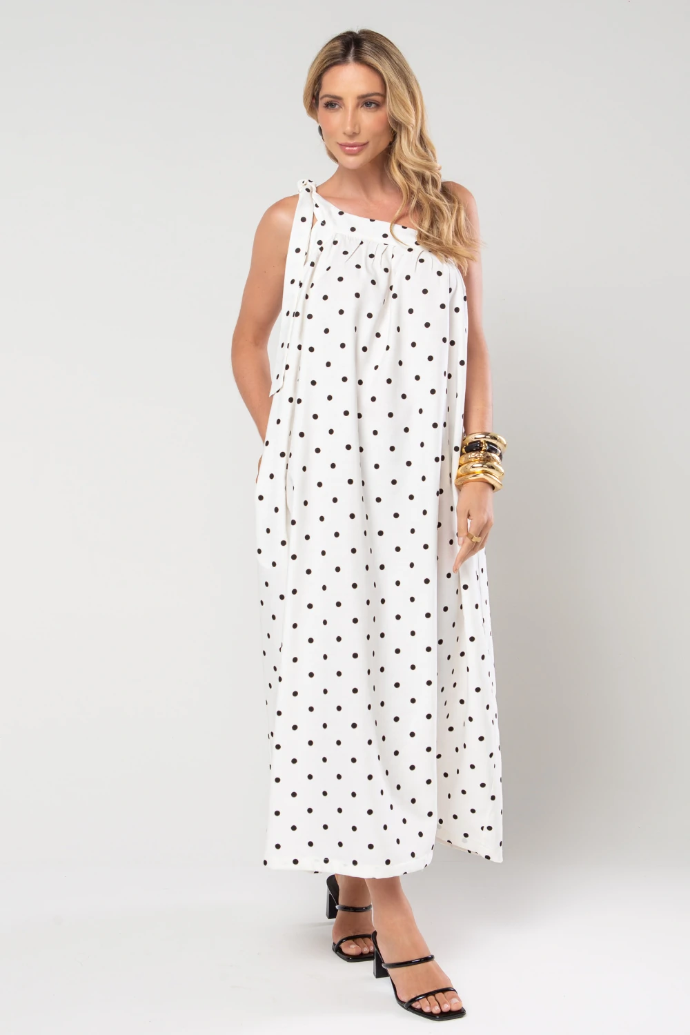 A modelagem assimétrica destaca o ombro com um toque ousado e feminino, enquanto a estampa de bolinhas clássicas adiciona um ar vintage irresistível.