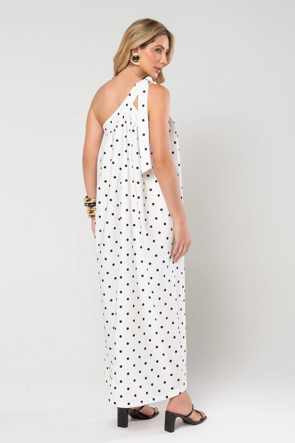 O charme retrô encontra a sofisticação moderna neste vestido midi de um ombro só em estampa poá.