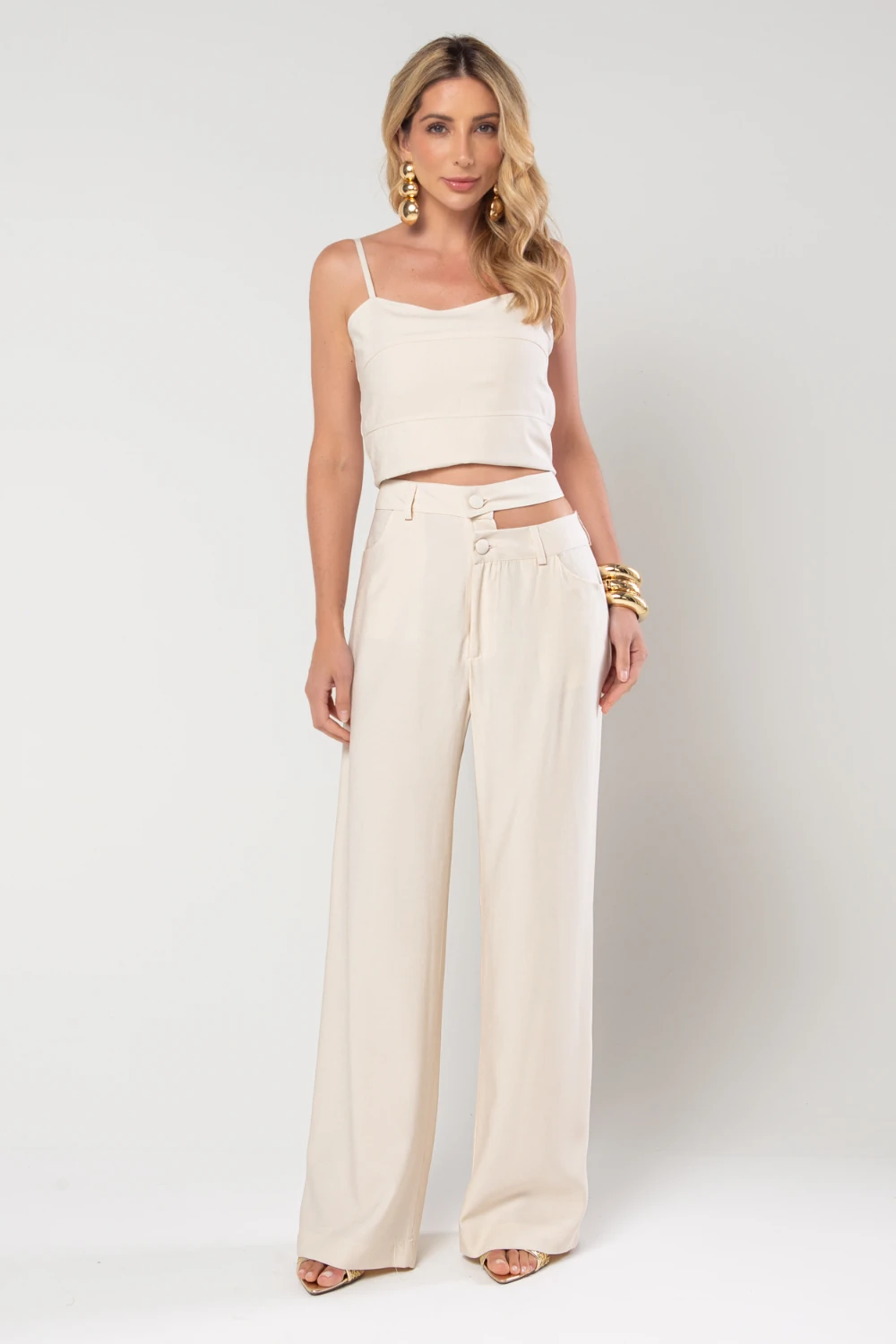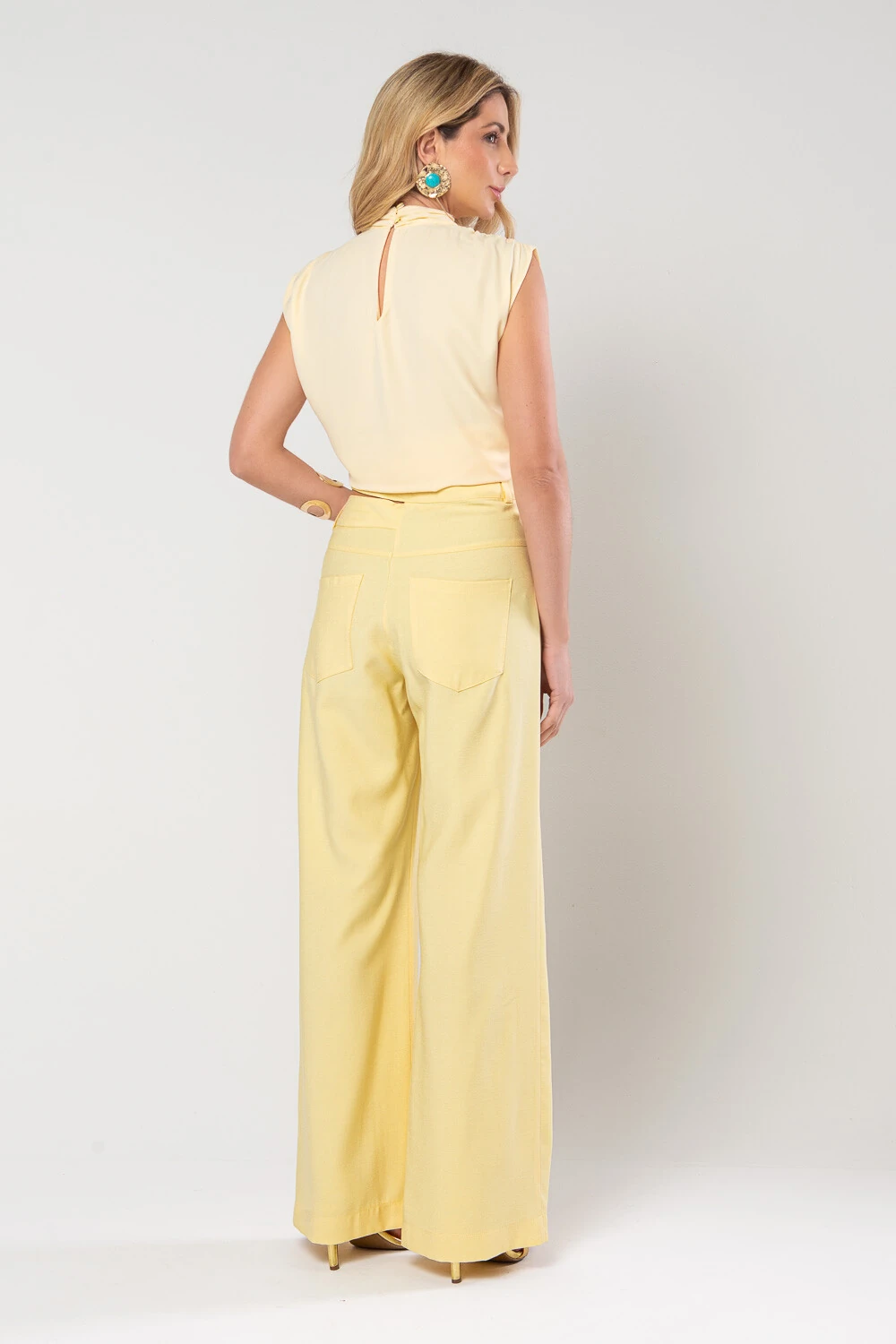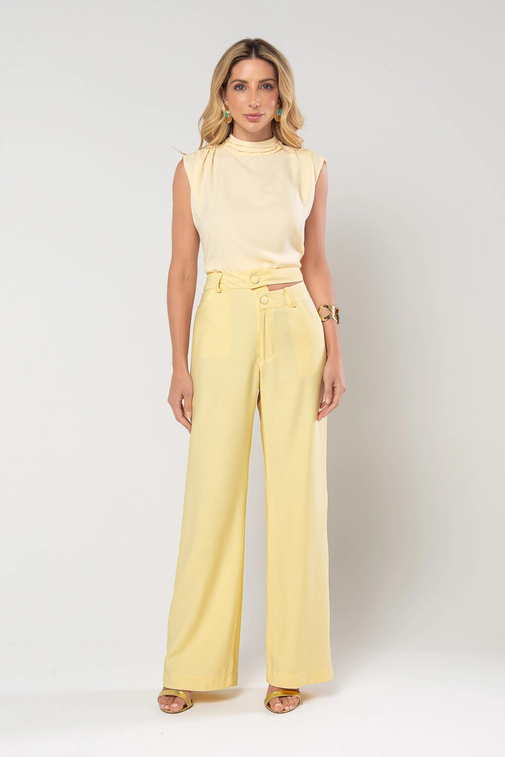 Calça de modelagem pantalona, confeccionada em alfaiataria de viscose.