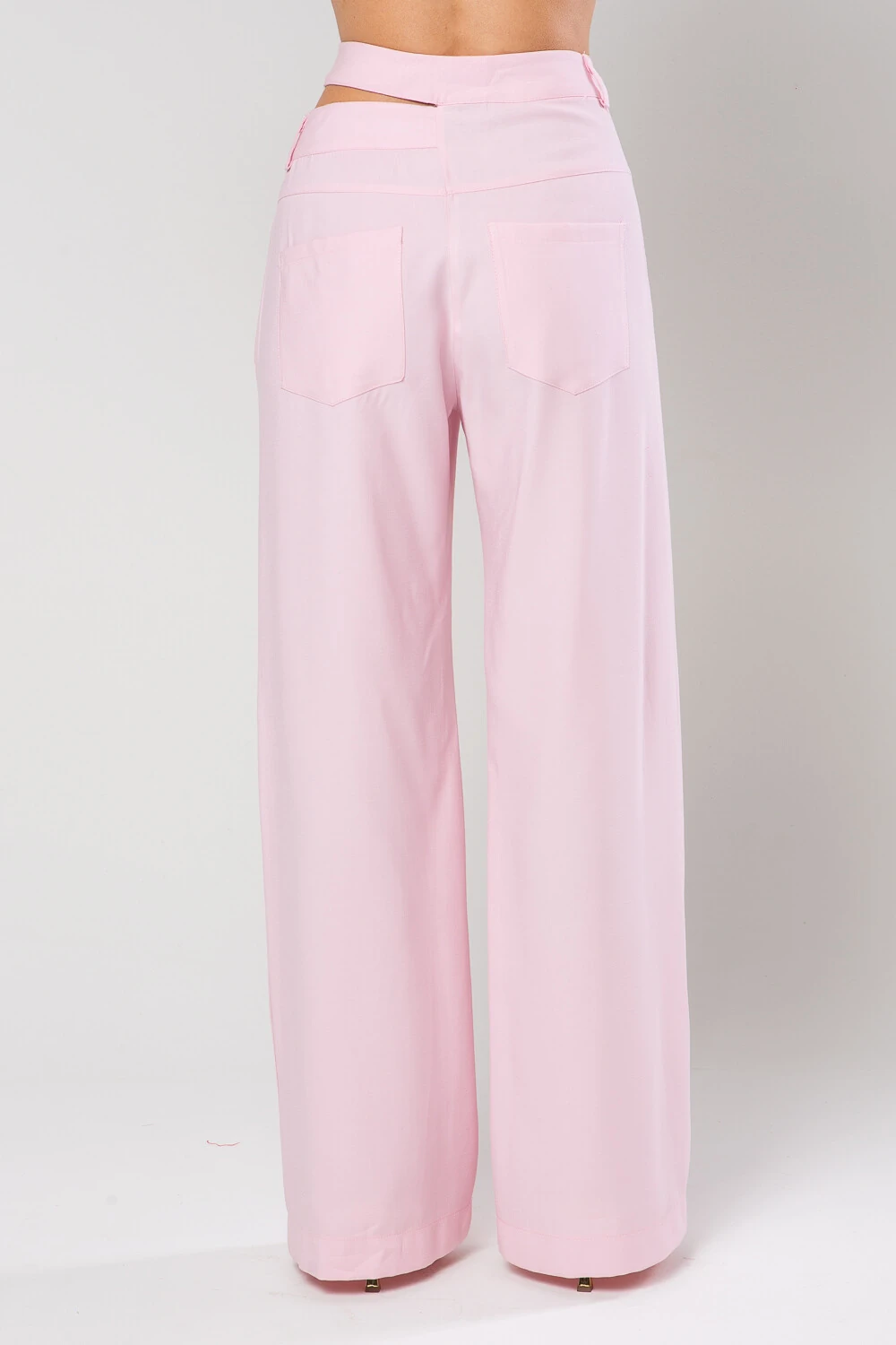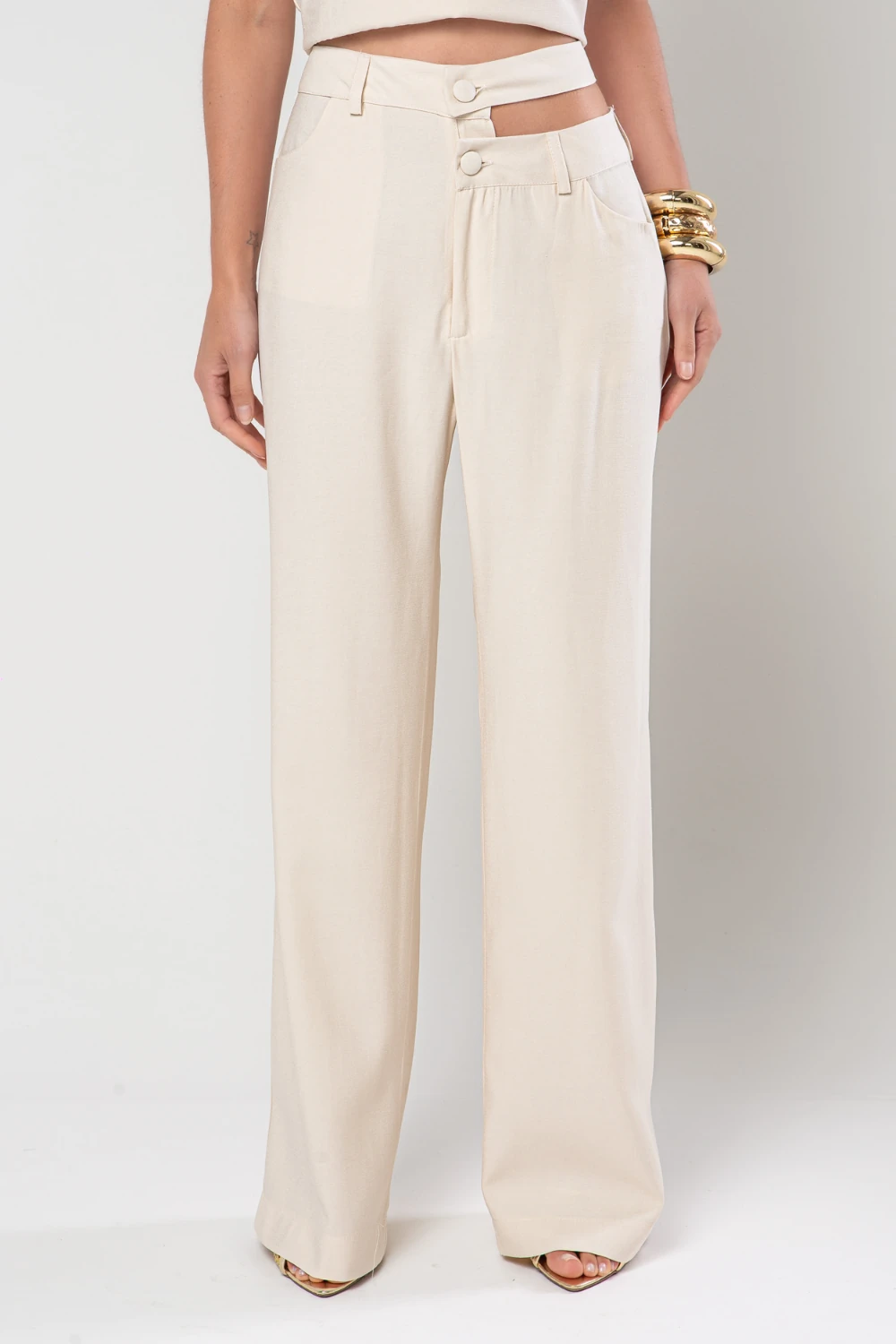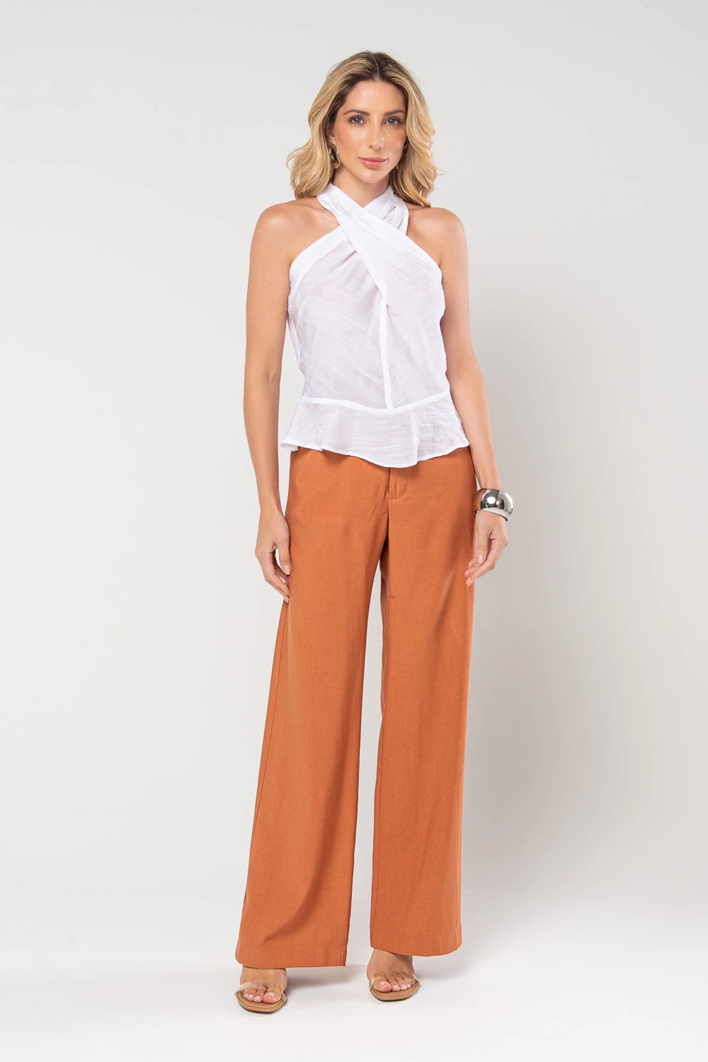 Calça de modelagem pantalona, confeccionada em alfaiataria de viscose.