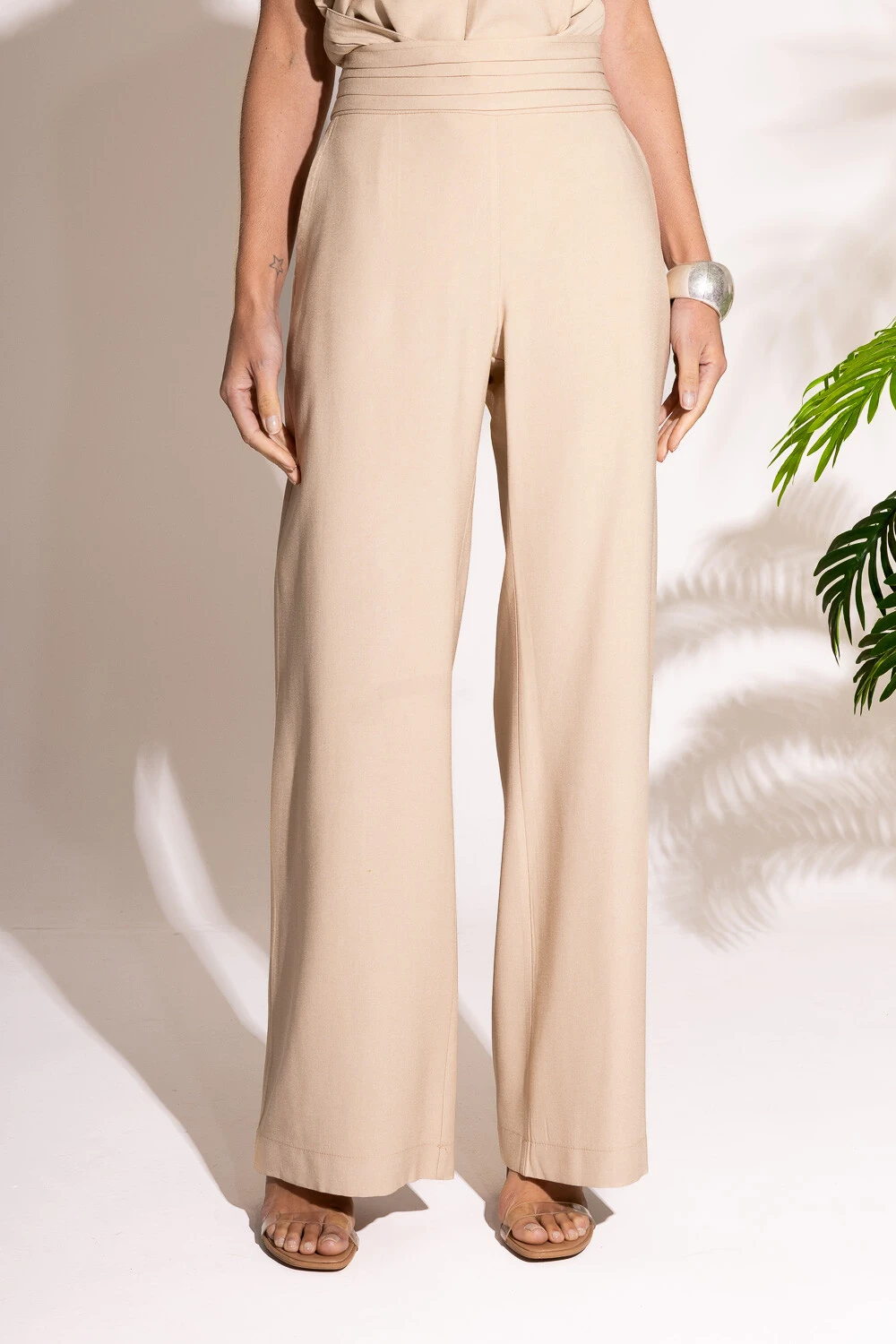 A calça traz detalhe franzido frontal e fechamento lateral por zíper, garantindo um caimento impecável.