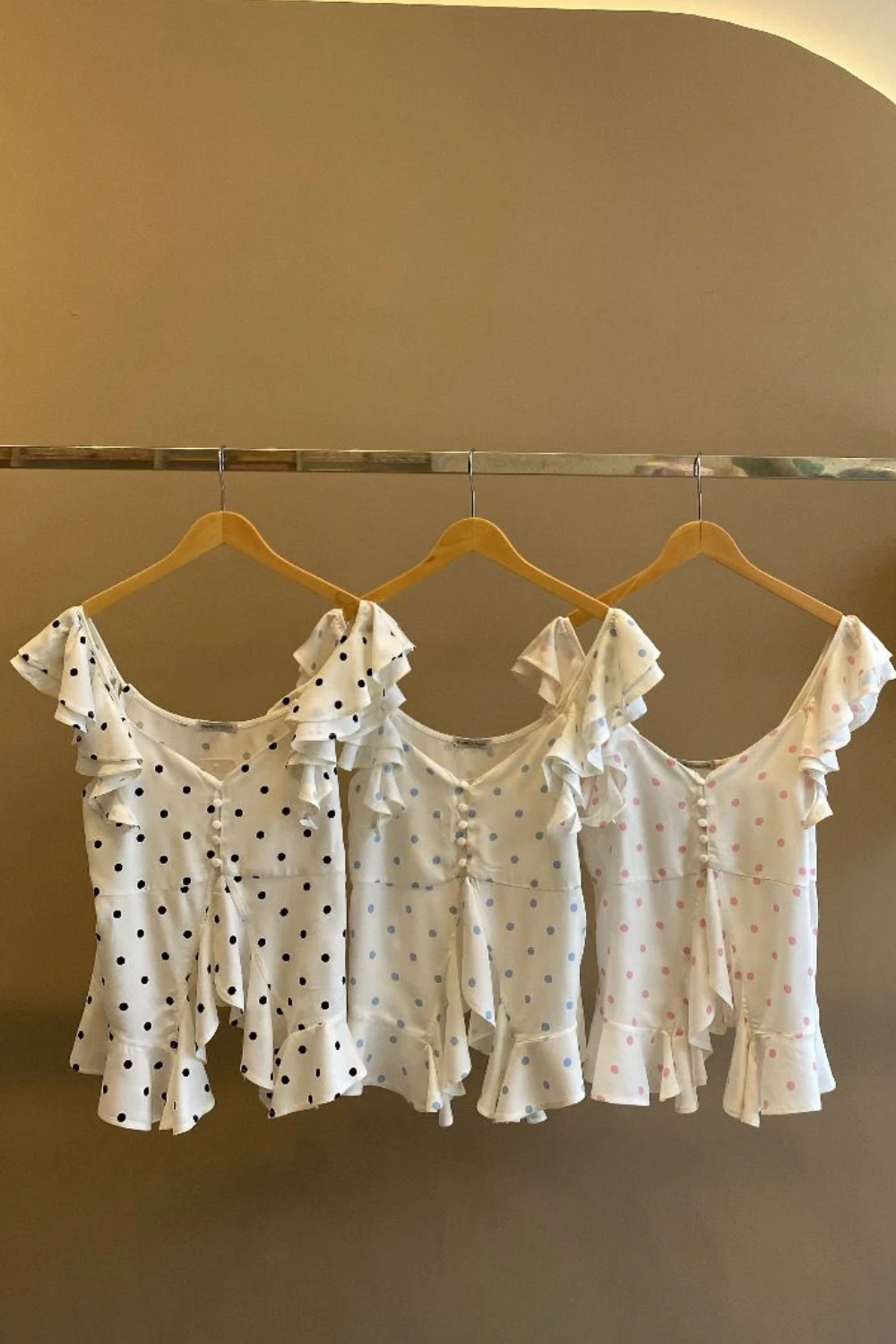 BLUSA POÁ LILI Estampa poá com toque romântico e clássico. Babados nas mangas e barra. Elástico nas costas para mais conforto. Fechamento frontal com botões forrados no mesmo tecido. COMPOSIÇÃO: 100% VISCOSE