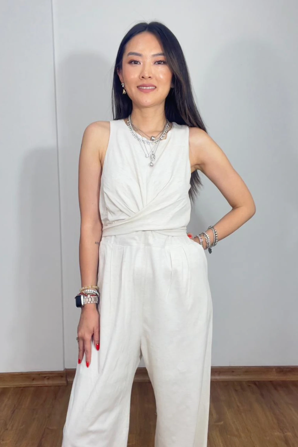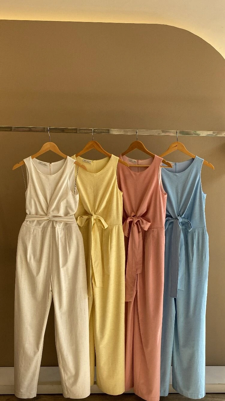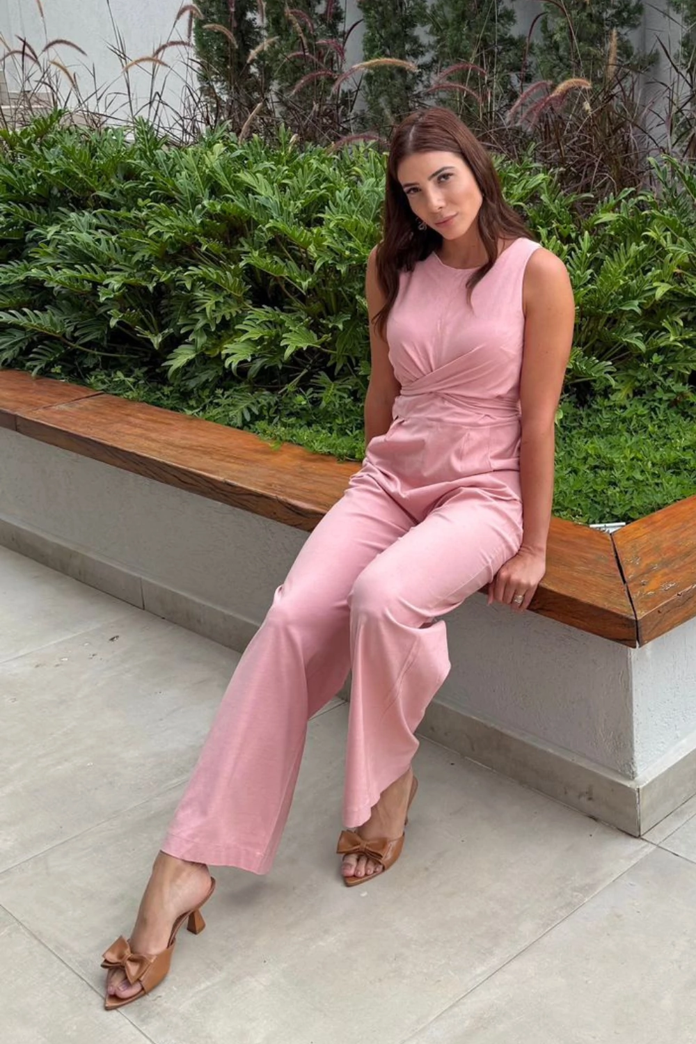 Confeccionado em um mix de viscose, linho e elastano. Modelagem pantalona, possui alças larga e faixa na cintura, podendo ser usada de diversas maneiras.