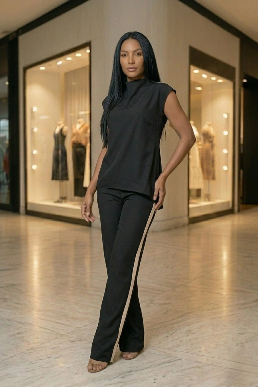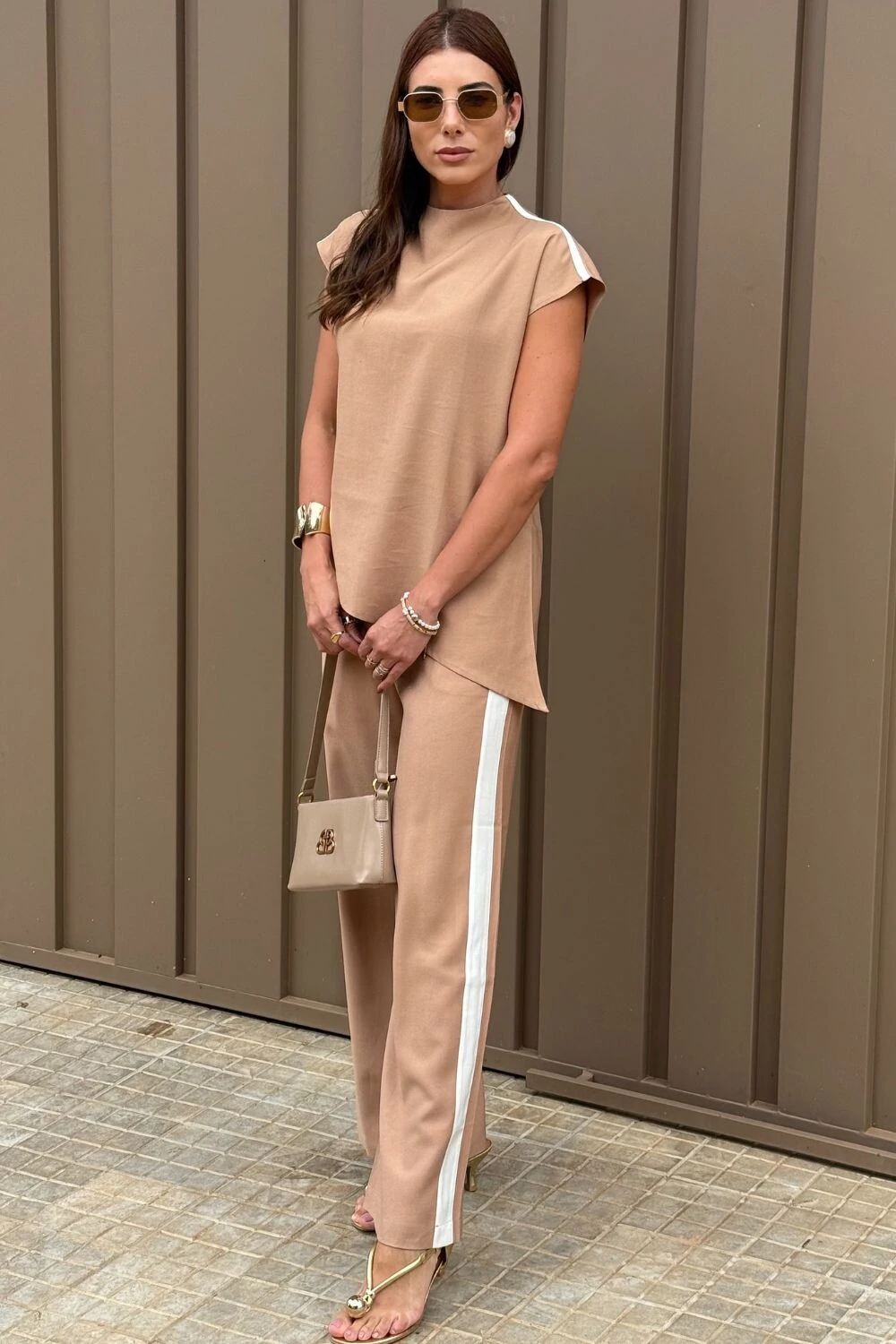 Blusa gola alta, manga morcego e assimetria na lateral além de possuir faixas brancas trazendo a união do casual chic que amamos.