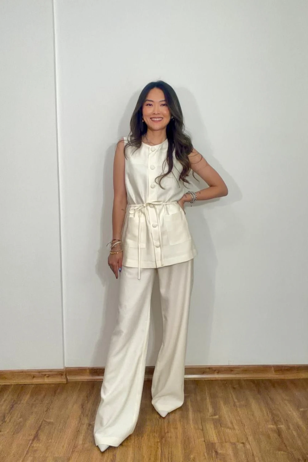 CONJUNTO LUISA confeccionado em alfaiataria de viscose Marant. Blusa estilo max colete, com botões forrados na mesma cor e tecido, bolsos frontais e amarração delicada na cintura que valoriza a silhueta. Acompanha calça de modelagem reta e caimento impecável.