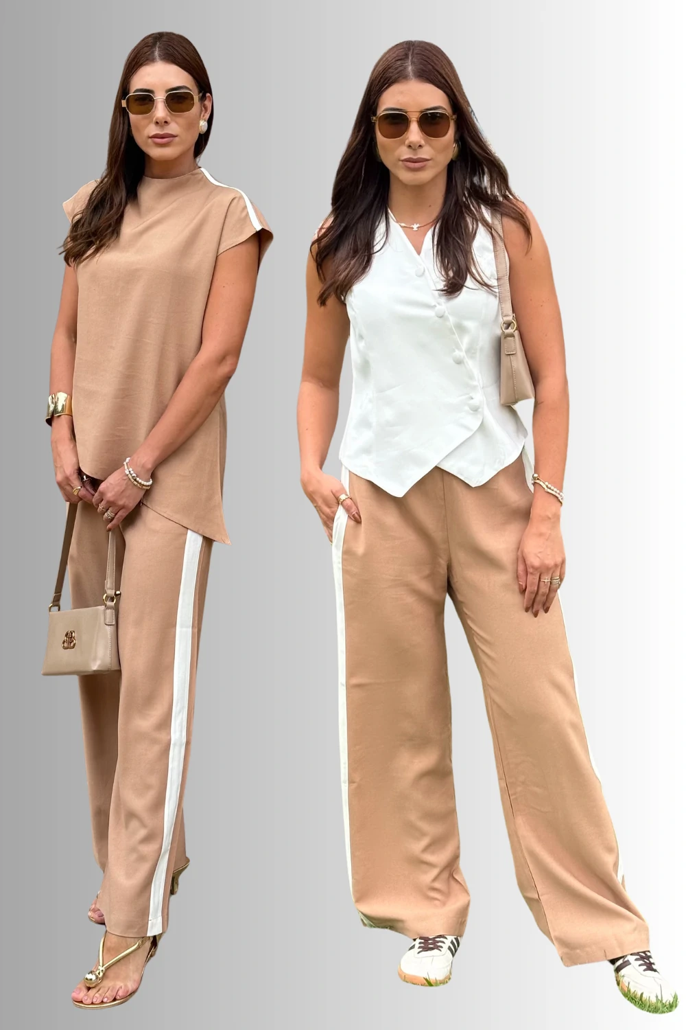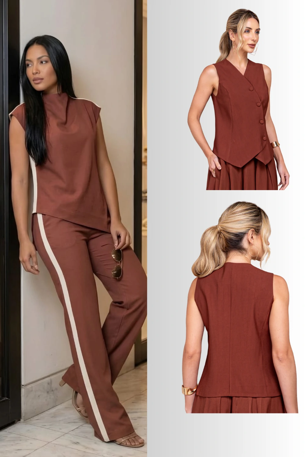 Composto por um conjunto Luna + Colete Sandra, perfeito para multiplicar looks sem perder a elegância e nem abrir mão do conforto!